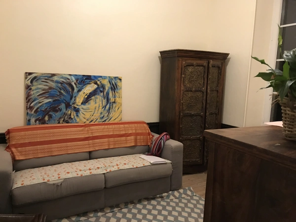 Un salon-séjour chaleureux avec parquet ancien et poêle à bois